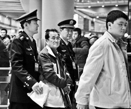 2月17日下午,中國通緝犯曾漢林(左二)乘坐從加拿大多倫多起飛的航班被遣返回國,抵達(dá)北京首都國際機(jī)場。新華社發(fā)