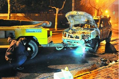 “在上清路與尖山路路口,一輛停在路邊的越野車突然起火了,火勢很大?!弊蛱焱砩?點(diǎn)35分左右,市民朱先生撥打早報(bào)熱線82888000報(bào)料。記者聞?dòng)嵹s到現(xiàn)場時(shí),消防人員已經(jīng)將火撲滅,記者看到,著火的是一輛越野車,整個(gè)車身已經(jīng)被燒成了空殼,車內(nèi)一片狼藉,而停在越野車前面的一輛別克轎車,車尾被高溫烤壞,烤化了的保險(xiǎn)杠都掉在地上?!斑@是我?guī)讉€(gè)月前剛買的新車,平時(shí)我開車的時(shí)候都是小心翼翼,沒想到如今成了這副模樣,叫我怎么能不心疼?!避囍鞲嬖V記者,他花了30多萬買下這輛斯巴魯越野車,新車還沒開過癮就被燒成了“廢柴”,他每晚都把車停在這個(gè)地方,沒發(fā)現(xiàn)過什么問題。