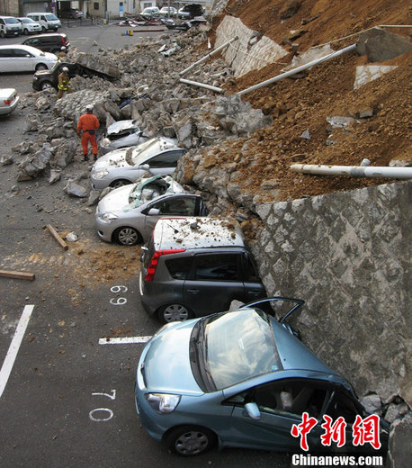 日本近海3月11日發(fā)生了強(qiáng)烈地震,首都東京震感強(qiáng)烈。日本氣象廳隨即發(fā)布了海嘯警報,稱地震將引發(fā)約6米高海嘯。圖為茨城縣某停車場的車輛被倒塌的墻壁壓毀。