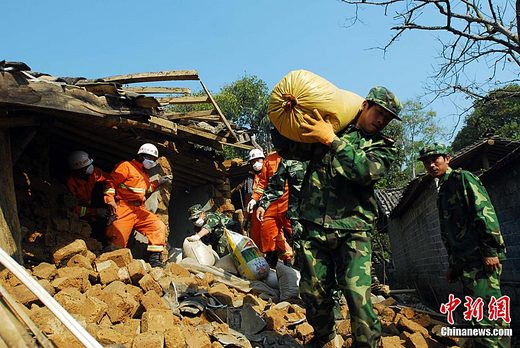 ????3月10日云南省德宏傣族景頗族自治州盈江縣發(fā)生5.8級(jí)地震后,盈江縣附近的傣族村寨房屋受損嚴(yán)重,消防官兵全力救助傷者,排除現(xiàn)場(chǎng)安全隱患,幫助村民搬運(yùn)埋在廢墟內(nèi)的物品。中新社發(fā) 任東 攝