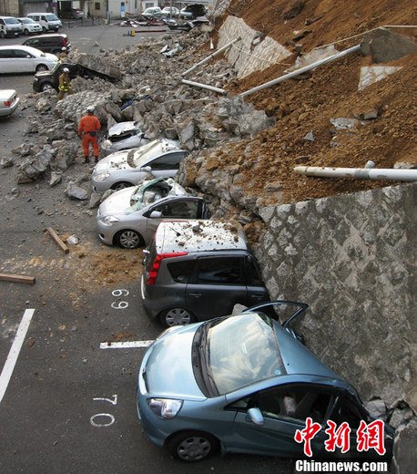 日本近海3月11日發(fā)生了強烈地震,首都東京震感強烈。日本氣象廳隨即發(fā)布了海嘯警報,稱地震將引發(fā)約6米高海嘯。圖為茨城縣某停車場的車輛被倒塌的墻壁壓毀。