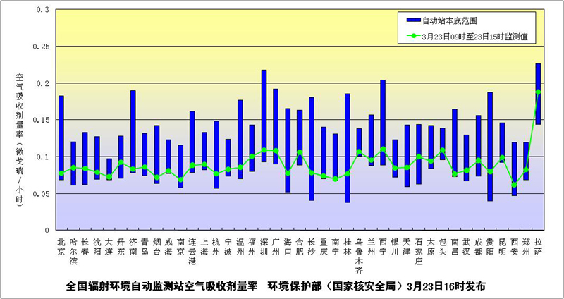 ????環(huán)境保護(hù)部(國(guó)家核安全局)有關(guān)負(fù)責(zé)人今日介紹說(shuō),環(huán)境保護(hù)部(國(guó)家核安全局)3月23日16時(shí)繼續(xù)發(fā)布全國(guó)省會(huì)城市和部分地級(jí)市輻射環(huán)境自動(dòng)監(jiān)測(cè)站實(shí)時(shí)連續(xù)空氣吸收劑量率監(jiān)測(cè)值。監(jiān)測(cè)結(jié)果匯總圖中綠色曲線代表監(jiān)測(cè)值,藍(lán)色柱體代表天然本底水平,綠色曲線均在藍(lán)色柱體范圍內(nèi)。監(jiān)測(cè)結(jié)果表明我國(guó)環(huán)境輻射水平未受到日本核電事故的影響。