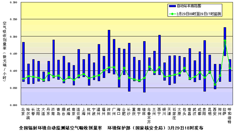 ????下圖是環(huán)境保護(hù)部(國家核安全局)3月29日18:00繼續(xù)發(fā)布的全國省會城市和部分地級市輻射環(huán)境自動監(jiān)測站實時連續(xù)空氣吸收劑量率監(jiān)測值。監(jiān)測結(jié)果匯總圖中綠色曲線代表監(jiān)測值,藍(lán)色柱體代表天然本底水平,綠色曲線均在藍(lán)色柱體范圍內(nèi)。監(jiān)測結(jié)果表明,目前我國環(huán)境輻射水平仍在本底范圍內(nèi),日本核電事故未對我國環(huán)境及境內(nèi)公眾健康產(chǎn)生影響。