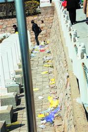 在福寧園里,10多名保潔工人背著蛇皮袋子撿垃圾,一些鮮花的包裝塑料紙、塑料袋經(jīng)常會看到,還有一些食品、果品。工人告訴記者,一上午他已經(jīng)撿了20蛇皮袋子的垃圾了。