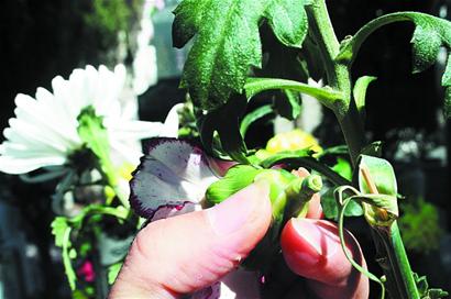 市民王女士見路上商販?zhǔn)圪u的鮮花顏色比較鮮艷,就花10元買了一束。當(dāng)祭祀結(jié)束,她準(zhǔn)備將菊花上的花瓣一點點掰下來撒在墓碑上時,卻發(fā)現(xiàn)菊花的花球和花莖居然斷裂開了。仔細(xì)一看,才發(fā)現(xiàn)這“鮮花”是用牙簽連接起來的?!霸诼飞狭鲃淤u鮮花的就有五六十人,哪還能找到賣花的人,只能吃啞巴虧了?!蓖跖空f。