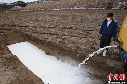 3月23日,日本福島縣Iitate,一位農(nóng)民將牛奶倒入土坑中。福島縣周邊地區(qū)原奶和蔬菜等農(nóng)畜產(chǎn)品的受輻射污染范圍23日呈擴大態(tài)勢,首相菅直人當(dāng)天首次要求人們不要食用福島縣生產(chǎn)的一些種類的農(nóng)產(chǎn)品。