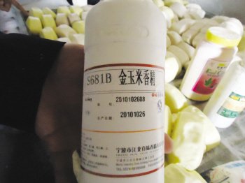 作坊的臺(tái)面上放了5瓶液體物和3包固體物。5瓶液體物分別是“檸檬黃60”、“甜玉米香精”、“金玉米香精”;3包固體物分別是“糖精鈉”、“紅蘋果高活性干酵母”。