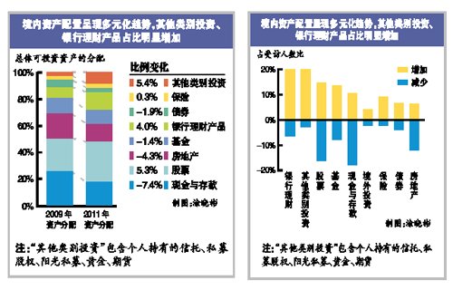 就富人的投資方向而言,2009年初,以現(xiàn)金與存款、股票、房地產(chǎn)和基金為代表的傳統(tǒng)投資類別占比高達(dá)80%左右,至2011年,四類資產(chǎn)占比下降至70%左右。
