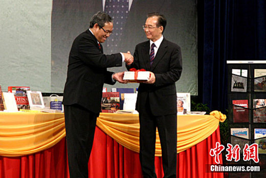 當(dāng)?shù)貢r(shí)間4月27日,正在馬來西亞進(jìn)行正式訪問的中國總理溫家寶參觀馬來亞大學(xué)并與師生交流。參觀結(jié)束后,溫家寶向該校校長贈送圖書。中新社發(fā)周兆軍 攝