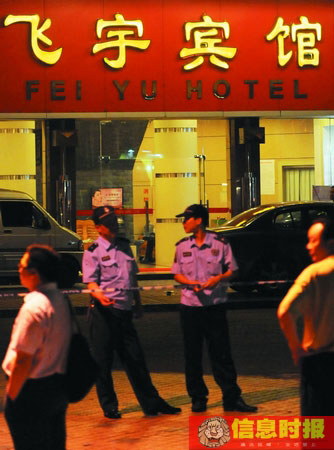 事發(fā)的飛宇賓館門口,警察拉起警戒線。信息時(shí)報(bào)記者 葉偉報(bào)攝