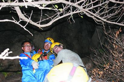 前晚8時32分,紅十字青島藍天救援隊的李延照隊長接到求助電話后,22名救援人員立即整理裝備,驅(qū)車半個小時從城陽趕到浮山腳下登山救援。晚上10時左右,第一梯隊9名隊員順利爬上懸崖頂部。“如果強行拖拽,救援繩索可能出現(xiàn)磨損斷裂,造成被困游客二次傷害?!崩钛诱贞犻L判斷地形后,調(diào)整救援方案,改用索降的方式,直接將救援人員索降到杰森身邊,另外7名隊員此時也趕到崖底接應(yīng),崖底荊棘遍布,只有一塊能站兩人的石頭落腳,因為山頂?shù)木仍藛T蹬踏,不時有石塊滾下。另外6名救援隊員在山下不時通過對講機跟被困的杰森用英語溝通,安撫他的情緒。
