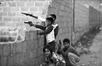 5月7日,巴基斯坦首都伊斯蘭堡附近的阿伯塔巴德市,幾名兒童在恐怖大亨本拉登的最后藏身處附近持塑料槍玩耍。拉登被擊斃后,他的支持者頻繁在巴基斯坦展開報復(fù)行動。拉登之死,并未讓巴基斯坦的局勢平穩(wěn),一些部落和邊境地區(qū)的恐怖勢力遠未被清除。