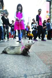 “臺(tái)東三路這邊有人在遛貂,還會(huì)做很多高難度動(dòng)作,你們快來看看吧! ”昨日下午,市民馮先生撥打本報(bào)熱線82860085報(bào)料,稱活了60多年的他見過養(yǎng)貓養(yǎng)狗養(yǎng)兔子的,可養(yǎng)貂還是第一次見。昨日下午,記者聞?dòng)嵹s到臺(tái)東三路步行街看到,一名年輕女孩正牽著一只灰白色的貂在玩耍,旁邊站滿了圍觀的市民,有不少市民還紛紛拿出相機(jī)和貂合影。 “哎呀,太可愛了,這可是我第一次見貂呢! ”青島大學(xué)的小劉一邊愛憐地?fù)崦酰贿呞s緊讓男友幫忙拍照。記者看到,這只貂長(zhǎng)著灰白色的毛,樣子像松鼠,體長(zhǎng)有30多厘米,一雙圓溜溜的小眼珠來回看著周圍的人群,還不時(shí)伸出小爪子和主人討要食物。貂主人韓雪告訴記者,這只貂是他們寵物店的,每天下午都要帶出來遛遛,“這樣有利于鍛煉它們的身體,多見見人也好培養(yǎng)它們與人類更好的相處。 ”韓雪告訴記者,這只貂才兩個(gè)月大,可是在他們的訓(xùn)練下已經(jīng)能做出不少高難度的動(dòng)作,“它們是很聰明的寵物,智商比貓還要高。 ”“轉(zhuǎn)個(gè)圈、揮揮手打個(gè)招呼……”在韓雪的指揮下,小貂有條不紊地轉(zhuǎn)身180度,站直了身子伸出小爪子,滑稽的動(dòng)作惹得圍觀的市民哈哈大笑,而韓雪也不失時(shí)機(jī)地獎(jiǎng)勵(lì)它一點(diǎn)食物。