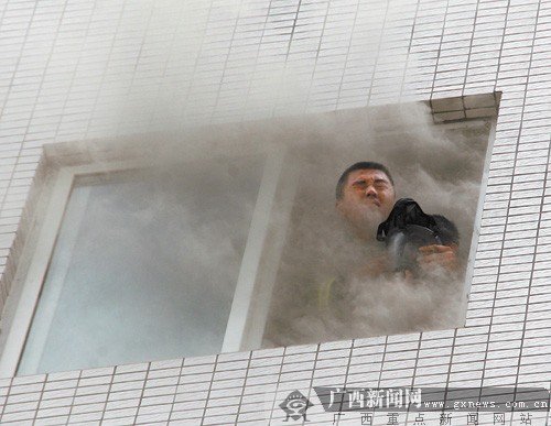 5月22日下午,欽州市翰林福第小區(qū)14棟一樓的配電箱失火,電纜絕緣體燃燒產(chǎn)生的濃煙順著電纜井直往上沖。36戶住戶的47人被困樓內(nèi),其中4人已昏迷。消防員冒著濃煙沖出火場,將他們一一救出。在冒著濃煙的窗口,出現(xiàn)了感人一幕:一名消防員將自己的呼吸器摘下,給剛從電梯里救出來的小男孩戴上。