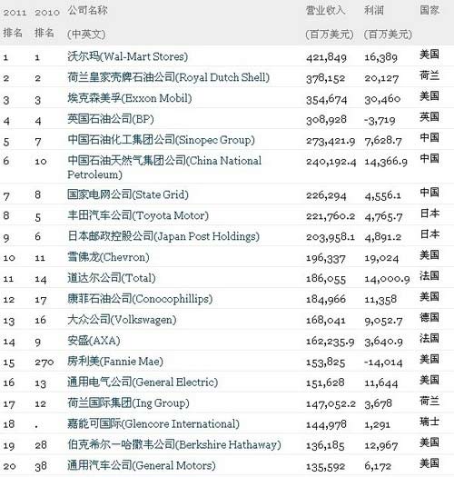 中新網(wǎng)7月7日電 北京時間7月7日晚,2011年《財富》世界500強(qiáng)排行榜正式發(fā)布。美國零售業(yè)巨頭沃爾瑪再次登上榜首,中石化排在第五,是國內(nèi)企業(yè)排名最高的。中國大陸共有61家公司進(jìn)入榜單,比上一年增加了15家。如果計入臺灣地區(qū)的上榜企業(yè),中國的上榜公司數(shù)量達(dá)到69家,超過日本,僅次于美國(133家),創(chuàng)造歷史紀(jì)錄。
