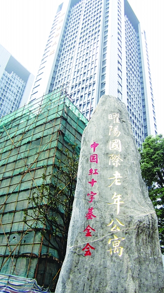 有市民向本報96096反映,其實南京也有中國紅十字會籌辦的曜陽老年公寓,地址就在南京市龍蟠路153號的御湖國際大廈的A棟。昨天,記者在上述地址看到,御湖國際大廈共有兩棟獨立建筑,每棟都在30層以上,而在御湖國際大廈A棟門前,一塊高約10米的巨石上醒目地刻著“中國紅十字基金會曜陽國際老年公寓”(如圖)。