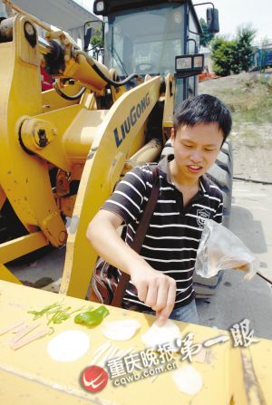 重慶晚報記者將豬肉片、牛肉片、土豆絲等食材分成兩份,一份放在鐵盤上,一份直接放置在推土機的鐵板上。同時打一個雞蛋,攪拌均勻,平攤在另一塊鐵盤中,任其在炙熱太陽下烘烤。