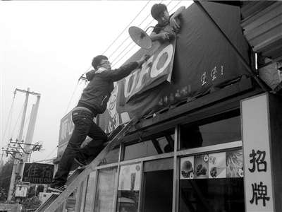 昨天下午,記者再次來到這家小餐館,店主之一朱寶來正在梯子上換招牌,將“OFC”換成了“UFO”?!拔乙埠ε氯巧瞎偎尽!敝鞂殎硖寡?,自己向來喜歡設計,奧巴馬的頭像和“OFC”的名稱,他只是覺得挺有創(chuàng)意,并沒想很多,然而被英國《每日郵報》報道后,引起國內(nèi)多家媒體的關注。對于是否侵權,他這幾天去咨詢了相關的機構和人士,但都沒有得到一個肯定的答案,于是干脆將原來的店名換掉。