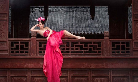 干露露古宅拍攝大片 穿桃色紗裙妖艷動人(圖)