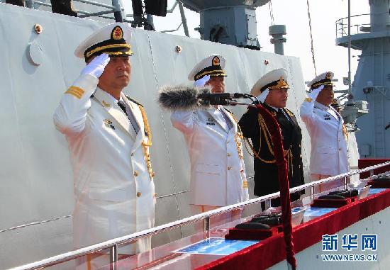 4月26日,中央軍委委員、海軍司令員吳勝利(左一)乘坐“沈陽”號(hào)閱兵艦檢閱中俄雙方參演艦艇、飛機(jī)。當(dāng)日,參加“海上聯(lián)合-2012”中俄海上聯(lián)合軍事演習(xí)的雙方艦艇、飛機(jī)在青島附近黃海海域舉行盛大的海上閱兵儀式。這次海上閱兵主要包括艦艇19艘、飛機(jī)19架,采取海上分列式的方式依次通過閱兵艦接受檢閱。海上閱兵是“海上聯(lián)合-2012”中俄海上聯(lián)合軍事演習(xí)的第三階段。此前,中俄雙方已經(jīng)進(jìn)行 |