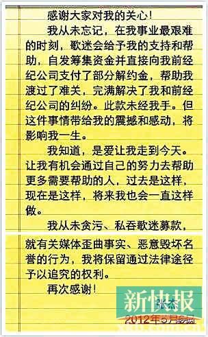 近日,一則“粉絲為張杰募集解約金”的質(zhì)疑帖在網(wǎng)絡(luò)上引發(fā)熱議,有網(wǎng)友質(zhì)疑2008年粉絲為張杰募集用于和“老東家”上騰解約的百萬元款項(xiàng)去向不明,而張杰當(dāng)年拿了這筆錢,卻沒有兌現(xiàn)對粉絲“舉辦不售票演唱會”的承諾。對此,張杰的經(jīng)紀(jì)公司方面全面封口。而上騰娛樂總經(jīng)理陳耀川則表示已收到賠償金,不會追究款項(xiàng)來源。