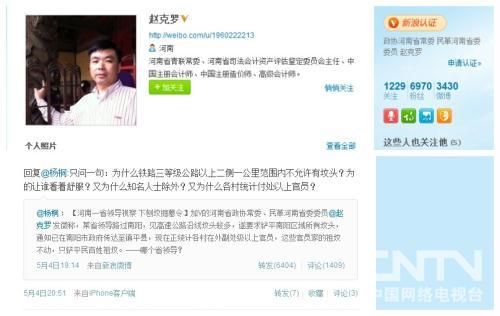 從5月3日發(fā)了第一篇微博開始,個人簡介為河南政協(xié)常委、民革河南省委員的網友“趙克羅”關于南陽平墳的微博就沒有停過。他發(fā)的關于平墳微博廣為擴散,網友楊桐的轉載更是被轉發(fā)6000多次。