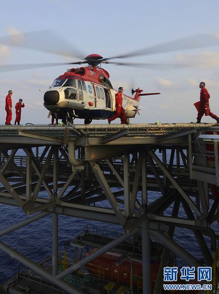 5月7日,一架直升機(jī)在“海洋石油981”鉆井平臺上降落。記者7日從中國海洋石油總公司獲悉,我國首座自主設(shè)計、建造的第六代深水半潛式鉆井平臺“海洋石油981”即將于9日在我國南海海域正式開鉆。 這將是我國石油公司首次獨立進(jìn)行深水油氣勘探開發(fā),標(biāo)志著我國海洋石油工業(yè)的深水戰(zhàn)略邁出了實質(zhì)性的步伐。 據(jù)了解,此次開鉆水域在我國南海水域距離香港東南320公里處,開鉆井深1500米(新華社記者 金良快 攝)