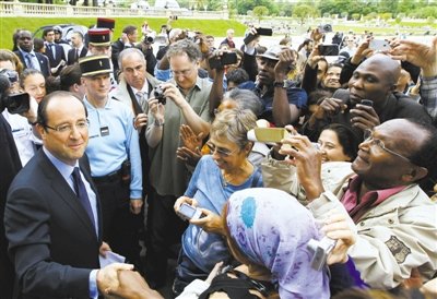 10日,奧朗德在巴黎參加一次活動時(shí)被民眾圍攏拍照
