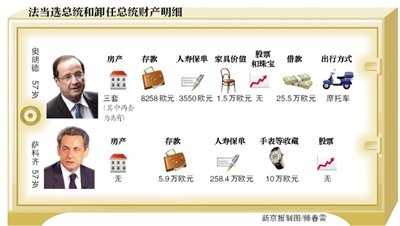 法新社報(bào)道,兩名總統(tǒng)的身家不包括伴侶或配偶資產(chǎn)。奧朗德與上屆總統(tǒng)選舉社會黨候選人羅雅爾共同生活逾25年,一直沒有結(jié)婚,育有4個(gè)孩子。他現(xiàn)在的伴侶是女記者瓦萊麗。薩科齊的妻子布魯尼是超級模特,同時(shí)是意大利一名實(shí)業(yè)家的女繼承人,個(gè)人財(cái)力雄厚。