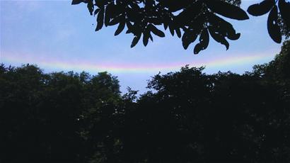 ????昨天,嶗山風(fēng)景區(qū)北九水景區(qū)晴空萬里,在北九水景區(qū)換乘中心東南方向的天空,出現(xiàn)了一道淡淡的彩虹,不少游客舉起相機(jī)拍攝。這道橫跨在北九水整個(gè)東南方向的彩虹,出現(xiàn)在昨天上午10時(shí)40分,起初一直倒掛在天際,直到中午11時(shí)30分,彩虹開始慢慢變直變淺,12點(diǎn)整彩虹才徹底消失在人們的視野里,前后持續(xù)1小時(shí)20分鐘。