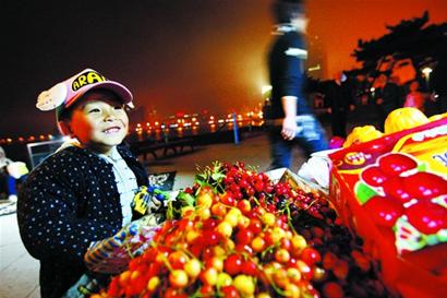 ????天暖了,但夜晚的海邊還是有點涼。昨晚6時,西陵峽路的夜市上,游人稀稀落落,攤販的數(shù)量甚至多過游人。郭淑霞像往常一樣,推著一輛4米多長、裝滿水果的兩輪車,從北京路的出租屋內走到棧橋擺攤。車上還坐著一個小孩,那是她的小兒子許良梁,今年才5歲。到了夜市,郭淑霞開始向游客和市民推銷水果,5歲的良梁就站在媽媽身邊,小家伙眼睛滾圓,長得很精神,看到媽媽顧不上照顧他,他就自己溜到旁邊的一個賣裝飾品的攤位玩。攤主李先生說:“這孩子真讓人省心,也懂事,從不惹禍,我們附近的小商戶都喜歡他,他是我們的開心果。 ”過了一會,良梁看媽媽有些累了,就跑回媽媽的水果車旁,像個大人一樣幫媽媽賣起水果。這時過來一名游客想要香蕉,良梁拿起一串扯著嗓門喊:“這是香蕉,阿姨要多少? ”這小大人的模樣逗得攤販和游客笑成一團。
