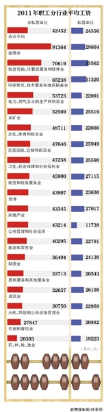 從具體來講,非私營單位金融業(yè)收入9萬多,私營單位僅2.86萬元,且低于2010年的3.05萬元。對此劉元春認為,非私營單位的金融業(yè)往往是典當行、保險代理等小公司,非私營單位則是大銀行,兩者不可同日而語。私營金融業(yè)收入比2010年還低,一方面是因為去年金融業(yè)形勢整體較差,此外也不排除有避稅因素。