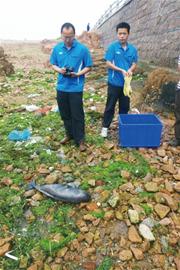 ????不一會,青島市水族館專家靳主任趕到了現(xiàn)場?!斑@是江豚,應(yīng)該是出生不久就死亡了,這么小的江豚尸體還是第一次見到?!苯魅尾榭唇嗪笳f,小江豚死亡原因還不明確,但肯定是內(nèi)因,因為江豚身上沒有漁網(wǎng)或船槳留下的痕跡。