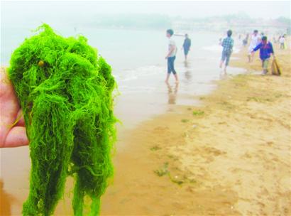 ????“我天天來(lái)三浴游泳,今天游泳的時(shí)候在海里也看到了滸苔,昨天游泳的時(shí)候還沒(méi)有呢。現(xiàn)在數(shù)量很少,零零星星的。 ”熱心的游泳愛(ài)好者侯先生走回離岸邊不足10米的海區(qū)撈上來(lái)一把滸苔。記者向海面望去,可以看到零星的小塊“綠斑”隨波逐流。