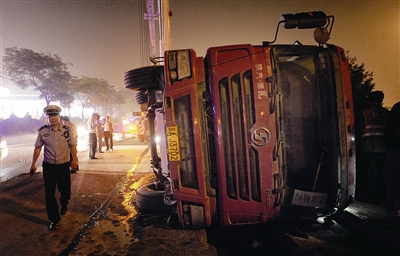 昨天晚上11點多,一輛十輪拉沙貨車在京港澳高速西道口出口輔路上“臥倒”,路旁施工的兩名工人被車上沙子掩埋。幸因工友及時挖救,兩名工人已經(jīng)沒有生命危險。