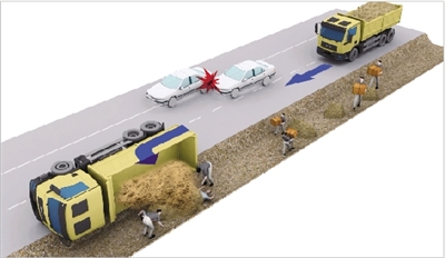 原來,大貨車想要繞過事故轎車超車前進,不料前車轱轆躲開了前面的車,后車轱轆卻難逃路邊的溝,“哐當(dāng)”一聲后,貨車緩緩向東側(cè)倒了下去。事發(fā)之后,正在施工的十來名工人被倒下的貨車“逼”到了綠化帶一角,兩名來不及躲閃的工人被埋在了沙子里面。