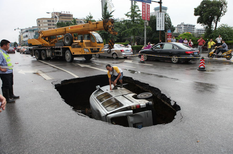 2012年6月7日凌晨約4:00時,廣西桂林市區(qū)地處上海路與輔星路交匯處的輔星路南端,發(fā)生一起道路塌陷事故,一輛哈飛小車不幸陷入其中。