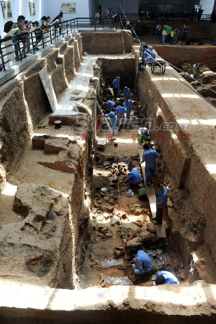 陶俑集中的第三過洞相鄰的兩個過洞,發(fā)現(xiàn)了封門痕跡。圖為百戲俑坑挖掘現(xiàn)場。