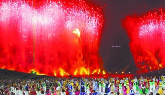 ????最激動人心的時刻在當(dāng)晚9時30分許到來。5名火炬手依次帶著從上屆亞沙會舉辦地馬斯喀特采集來的火種繞場一周后,將最后一棒火炬?zhèn)鬟f給北京奧運(yùn)會跳水冠軍王峰。王峰慢慢舉起火炬,一個手打燈籠的小姑娘出現(xiàn)在他面前,王峰的火炬和小姑娘的燈籠在空中進(jìn)行了一個象征意義的對接,恰在這時,一只散發(fā)著銀色光芒的“海鷗”從上空飛起,它嘴中的引線已然被火炬點(diǎn)燃。此后,在全場觀眾屏住呼吸的注目中 ,“海鷗”緩緩飛向主火炬塔。頃刻之間,小小的火種點(diǎn)燃引線,萬道火光聚集在一起向前沖去,主火炬瞬間熊熊燃起!