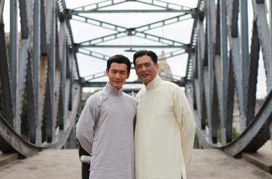 周潤發(fā)在《上海灘》中的許文強是經(jīng)典角色,黃曉明也在翻拍的《新上海灘》中出演過許文強,而在劉偉強監(jiān)制、王晶執(zhí)導(dǎo)的新片《大上?!分?,兩代許文強走到了一起?!洞笊虾!纺壳罢谏虾\嚩沼耙暬嘏臄z,昨日開放媒體探班,黃曉明身著長衫、梳著背頭首先亮相,而同樣打扮的周潤發(fā)隨后登場時,更引發(fā)全場歡呼。不獨媒體成影迷,一起合作的黃曉明、吳鎮(zhèn)宇、童菲都不約而同當(dāng)起小粉絲,黃曉明說自己剛?cè)胄邢矚g穿風(fēng)衣,梳大背頭,其實是下意識地在模仿發(fā)哥的《英雄本色》,也封周潤發(fā)為偶像的吳鎮(zhèn)宇說“他真的很厲害”,而新人童菲就只顧說“他好帥”。