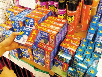 記者近日探訪了島城多家超市發(fā)現(xiàn),蚊香、驅(qū)蚊液、驅(qū)蚊片、殺蟲劑、電蚊拍等驅(qū)蚊滅蚊商品可謂琳瑯滿目,不少以前少見的高科技驅(qū)蚊工具紛紛登場(chǎng)。在香港中路一家超市百貨區(qū),記者看到貨架上擺放著各種樣式的蚊香。超市導(dǎo)購(gòu)人員告訴記者,近日天氣越來(lái)越熱,選購(gòu)蚊香的市民明顯增多,超市兩三天就會(huì)補(bǔ)一次貨。
