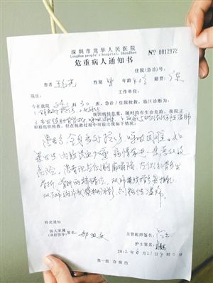 家屬見(jiàn)到王紅光已經(jīng)是6個(gè)半小時(shí)以后,20日上午8時(shí)許,王紅光的妹夫鄒先生聞?dòng)嵑筅s到交警中隊(duì)。鄒先生在當(dāng)?shù)赜嘘P(guān)部門(mén)任職,在他的介入下,王紅光被派出所警車(chē)送到三聯(lián)社區(qū)警務(wù)室?!芭沙鏊窬噲D讓我們和解,但大家一直僵持不下。20日中午12時(shí)許,距離我姐夫被打已經(jīng)過(guò)了將近10個(gè)小時(shí),看到我姐夫幾近昏厥,我強(qiáng)行將其帶走,送往龍華人民醫(yī)院搶救?!编u先生對(duì)記者說(shuō)。21日早晨8時(shí)許,龍華醫(yī)院向家屬下發(fā)了《病危通知書(shū)》,上寫(xiě)著:全身多處損傷,病情有進(jìn)一步惡化的危險(xiǎn)。