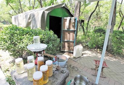“想要洋槐蜜?我這都是剛打出來(lái)的,30元兩斤,價(jià)格也不貴,來(lái)點(diǎn)吧。”在櫸林山上一個(gè)支著太陽(yáng)傘的攤位前,自稱(chēng)姓王的攤主來(lái)自日照,看到記者猶豫,王某主動(dòng)降價(jià),“20塊錢(qián)一斤半怎么樣?”王某回到帳篷里,用水舀子從一個(gè)白色的大桶里舀出顏色很淡的液體裝入瓶?jī)?nèi)。記者看到,除了幾個(gè)白色的大桶,帳篷內(nèi)的擺設(shè)很簡(jiǎn)單,沒(méi)有太多的生活用品和養(yǎng)蜂工具?!霸趺礇](méi)看到你的蜂箱?。俊庇浾咴?xún)問(wèn)。男子隨手往對(duì)面一指,“那些都是我的?!碑?dāng)記者要求他帶著過(guò)去看看時(shí),他卻推說(shuō)自己還有別的事。