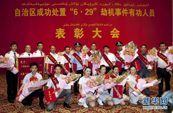 ????2日下午,自治區(qū)黨委、人民政府舉行大會,隆重表彰成功處置“6·29”劫機(jī)事件的有功人員。當(dāng)自治區(qū)黨委書記張春賢向每位有功人員頒發(fā)獲獎證書時,全場報以長時間熱烈的掌聲。