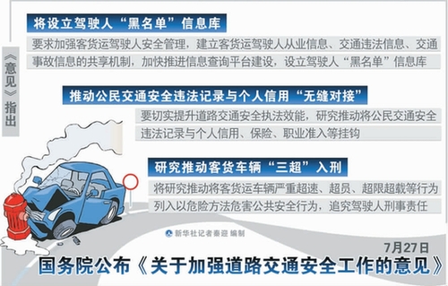????記者7月27日從中國(guó)政府網(wǎng)獲悉,國(guó)務(wù)院日前發(fā)布關(guān)于加強(qiáng)道路交通安全工作的意見(jiàn),要求加強(qiáng)客貨運(yùn)駕駛?cè)税踩芾?,建立客貨運(yùn)駕駛?cè)藦臉I(yè)信息、交通違法信息、交通事故信息的共享機(jī)制,加快推進(jìn)信息查詢平臺(tái)建設(shè),設(shè)立駕駛?cè)恕昂诿麊巍毙畔?kù)。意見(jiàn)指出,將研究推動(dòng)將客貨運(yùn)車輛嚴(yán)重超速、超員、超限超載等行為列入以危險(xiǎn)方法危害公共安全行為,追究駕駛?cè)诵淌仑?zé)任。
