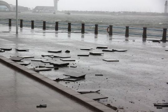 受昨夜臺風“ 達維”帶來的巨大海浪的影響,音樂廣場有不少的地板磚被巨浪沖毀。(青島新聞記者陳志偉攝影報道)