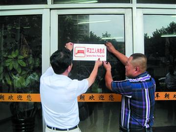青島晚報和市政公用局聯(lián)辦的“咱給環(huán)衛(wèi)工,添些休息點”活動啟動以來,不少商鋪紛紛打來熱線電話咨詢報名,想加盟“歇腳點”。昨天上午,市政公用局在車朝汽車俱樂部懸掛了首個“環(huán)衛(wèi)工人休息點”的標識牌,并將給已報名的230余家店鋪按照報名先后順序陸續(xù)懸掛標志。從昨天起,環(huán)衛(wèi)工人看見這個標識牌,就可以進去歇腳。另外市政公用局歡迎沿街商鋪繼續(xù)報名參加,年底將對各個歇腳點進行表彰。