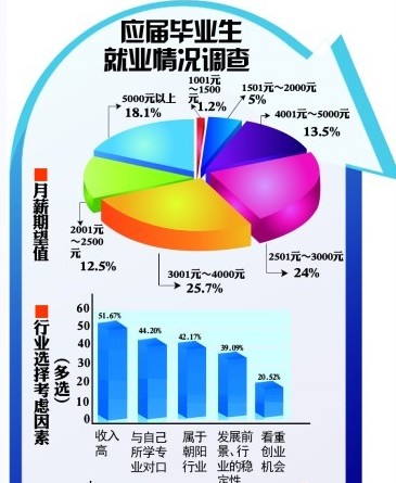 ????今年整體數(shù)據(jù)同去年相比,整體薪酬期望高于去年。每月1501元至2000元之間下降了6個百分點(diǎn),2001元至2500元之間下降了11個百分點(diǎn),2501元至3000元之間基本持平,3001元至4000元之間則上升了近5個百分點(diǎn),4001元至5000元之間則上升了近8個百分點(diǎn),5000元以上也上升了8個百分點(diǎn)。