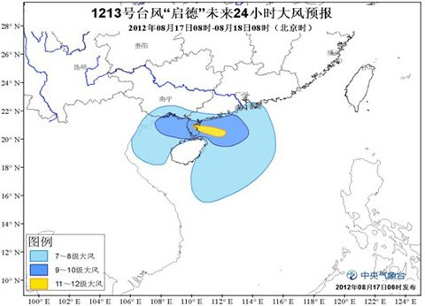 受“啟德”和西南季風(fēng)的共同影響,17日08時到18日08時,南海西北部海面、廣東西部沿海、海南東部及北部沿海、瓊州海峽、廣西沿海、北部灣海面將有7-9級大風(fēng),部分海域或地區(qū)風(fēng)力可達10-11級,“啟德”中心經(jīng)過的附近海域或地區(qū)的風(fēng)力有12-13級,陣風(fēng)可達14-15級;廣東西南部、廣西中南部、海南、云南東南部等地有大到暴雨,其中,廣東西南部、廣西南部、海南中北部的部分地區(qū)有大暴雨,局地有特大暴雨(250-300毫米)。