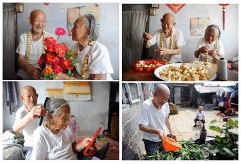 山東99歲的宮德云把親手在庭院里采摘的鮮花送給102歲的妻子孫玉翠,二人共同迎接婚后第83個七夕節(jié)。這對夫妻于1930年農(nóng)歷三月結(jié)婚,相濡以沫82載,屬于世界上婚齡最長的“橡樹婚”。老兩口生活能夠自理,每天拾柴燒火,吃飯換衣,養(yǎng)花散步。